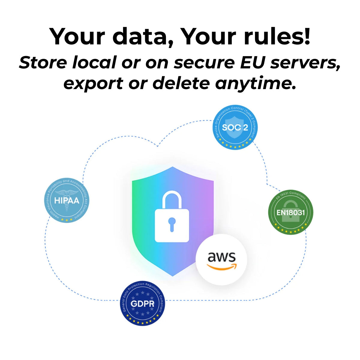 - Your data, your rules: Choose where to store it (on device or your preferred cloud), export or delete anytime.